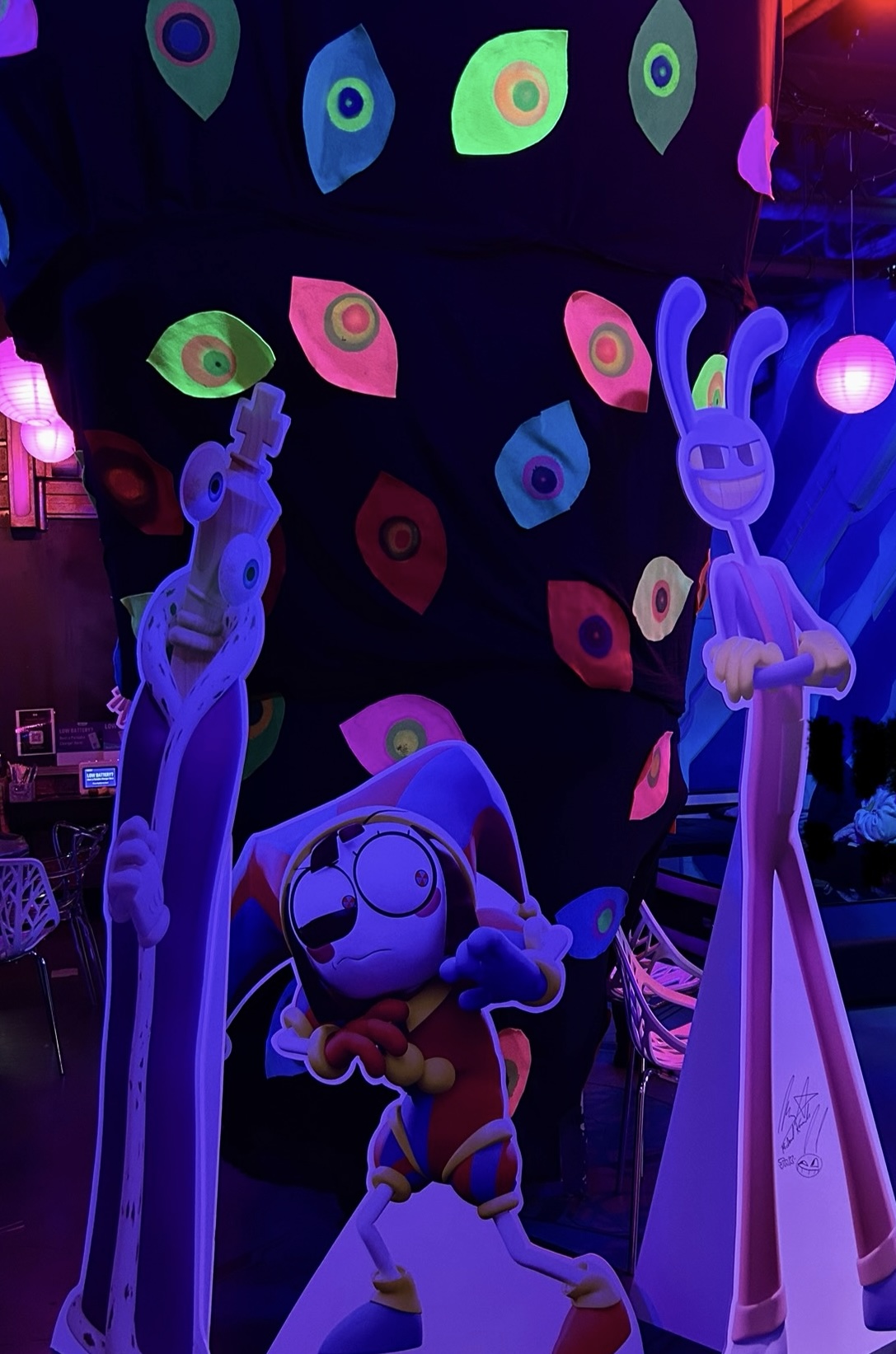 there were two scenes: an abstraction scene (pictured) and beach scene, each with character cut outs. i look pictures with jax, pomni, and kinger! really fun and cathartic in a way to have this narrative congruence—being immersed in a fictitious digital world that i find analogous to current reality in many ways.